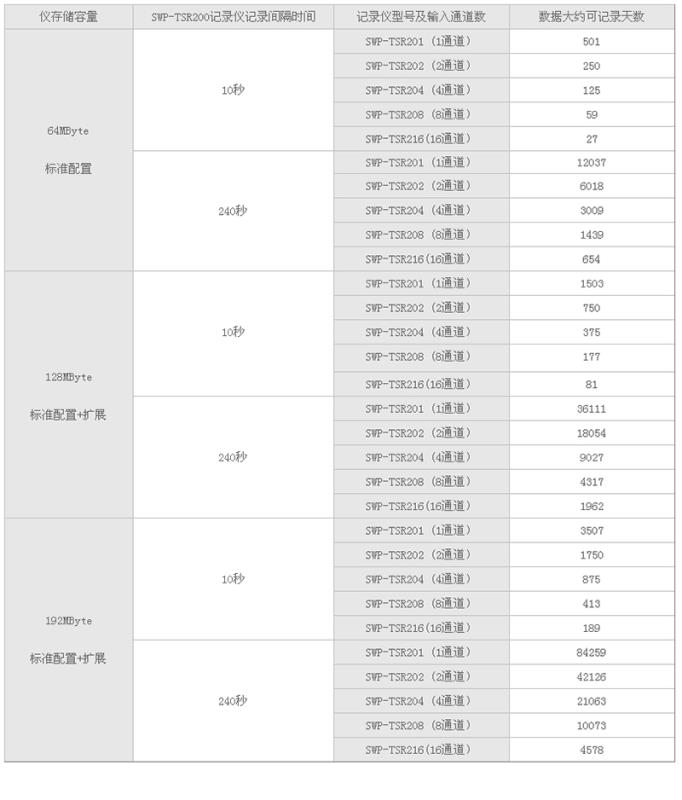 SWP-TSR100彩色無紙記錄儀數(shù)據(jù)記錄時間與儀表通道數(shù)量、無紙記錄儀記錄間隔時間和存儲空間有關(guān)系。可參看下表: