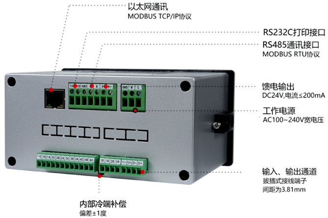 ③報警輸出:支持4路繼電器報警輸出,觸點容量3A/250VAC或3A/30VDC,可組態上上限、上限、下限、下下限報警