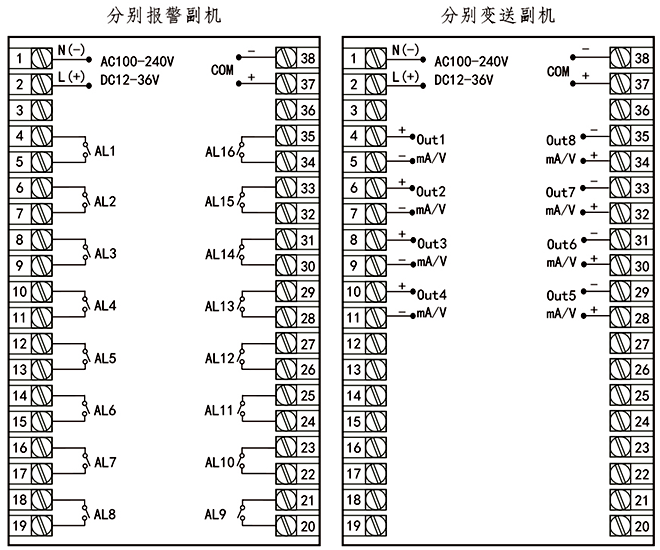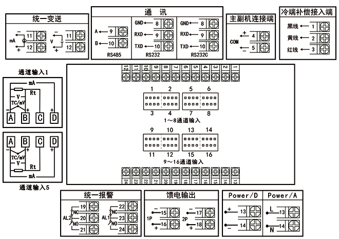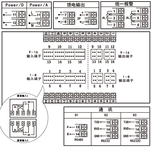 [2]:繼電器分別報警輸出(八路巡檢儀每1路輸入對應(yīng)2限報警,16路巡檢儀每路輸入對應(yīng)1個報警)