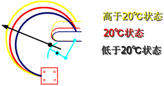 在體積不變的情況下,僅僅由于溫度變化而引起的任何壓力變化,都可以通過布爾登管和金屬片同時相應的變化得到補償,因此不會引起指針的偏轉,并確保壓力指示值的正確性。如下圖所示。