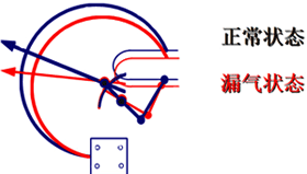 壓力元件對任何非溫度變化而引起的壓力變化的反應,都將轉化成氣體密度繼電器指針動作并反映到刻度盤上,并且可以監測到超出系統允許的最小或最大壓力的壓力值。如下圖漏氣情況。