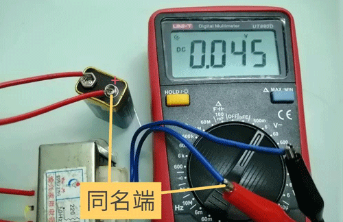 如上圖中,初級線圈接觸電池時(shí),次級產(chǎn)生的感應(yīng)電壓的正極是紅表筆所接的端口,所以電池正極所接的端口與萬用表紅表筆所接的端口是同名端。