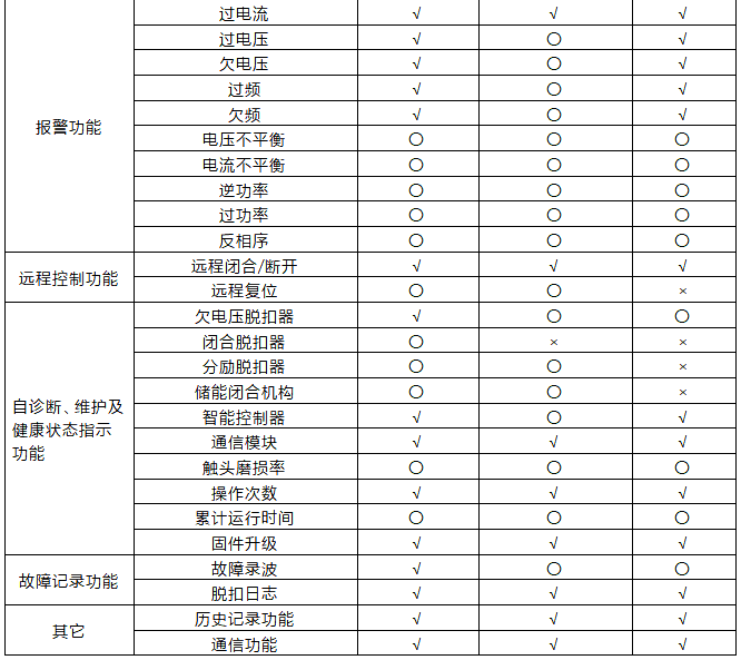 表中智能斷路器的“遠程復位”功能需謹慎!當過負荷或短路跳閘后不建議遠程復位,需人工現場排查故障后手動復位;萬能式斷路器的“電壓和電流不平衡”功能不需增加成本即可實現,故作為基本功能。